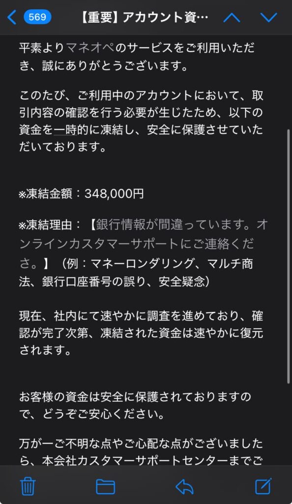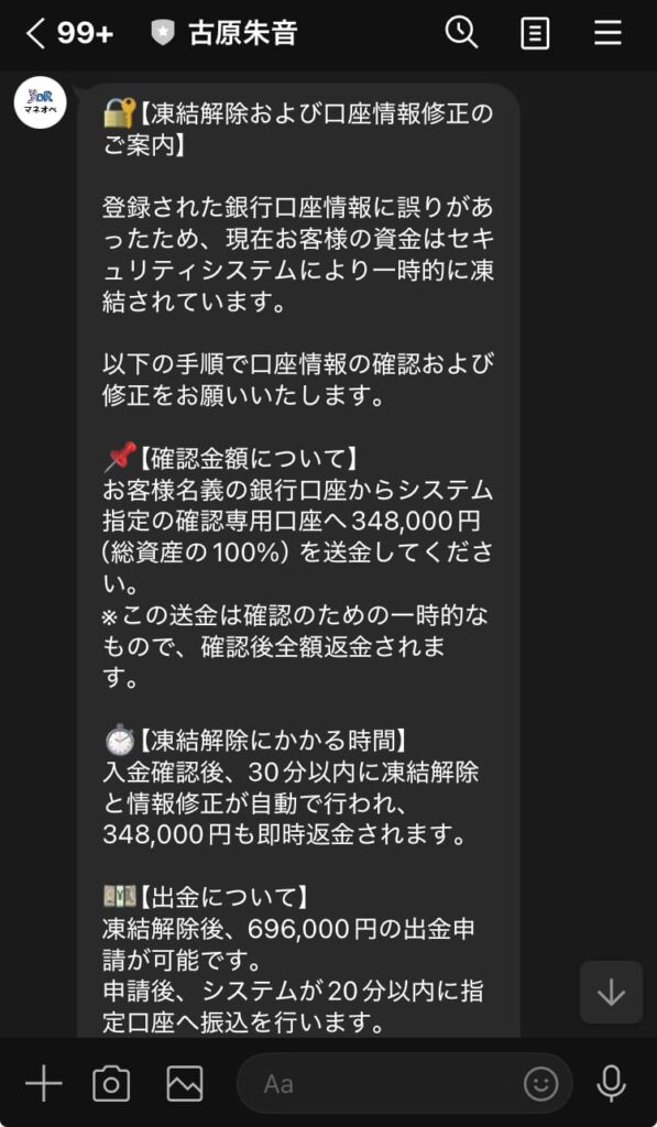 メッセージの人は、あなたを「マネオペ」というサイトに誘導し、そこで「口座が凍結しました」「同じ金額を振り込めば解除できます」